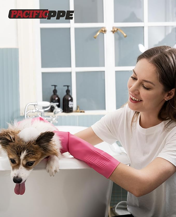 PACIFIC 2 Pairs Reusable Rubber Gloves for Washing Dishes and Cleaning Tasks, Water Resistant Household Gloves for Kitchen Bathroom, Grippy Latex Dish Washing, Pink, Meidum