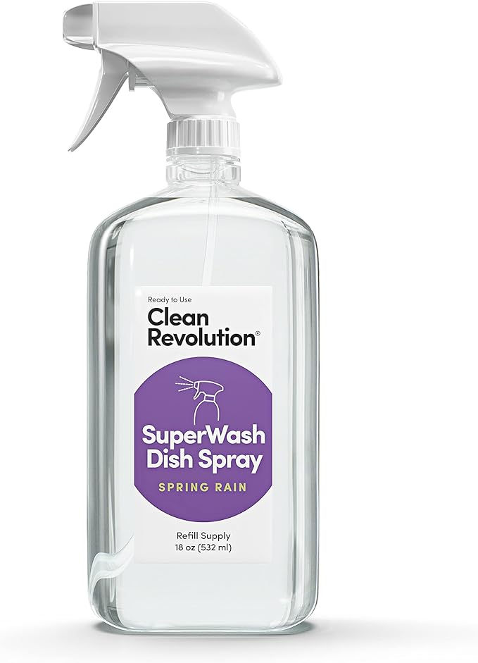 - POWERHOUSE FORMULA: Clean Revolution SuperWash Dish Spray features breakthrough cleaning agents that cut through grease and wipe away residue on contact without using as much water as traditional dish liquids, and features a natural fresh scent for that squeaky-clean feeling and smell.