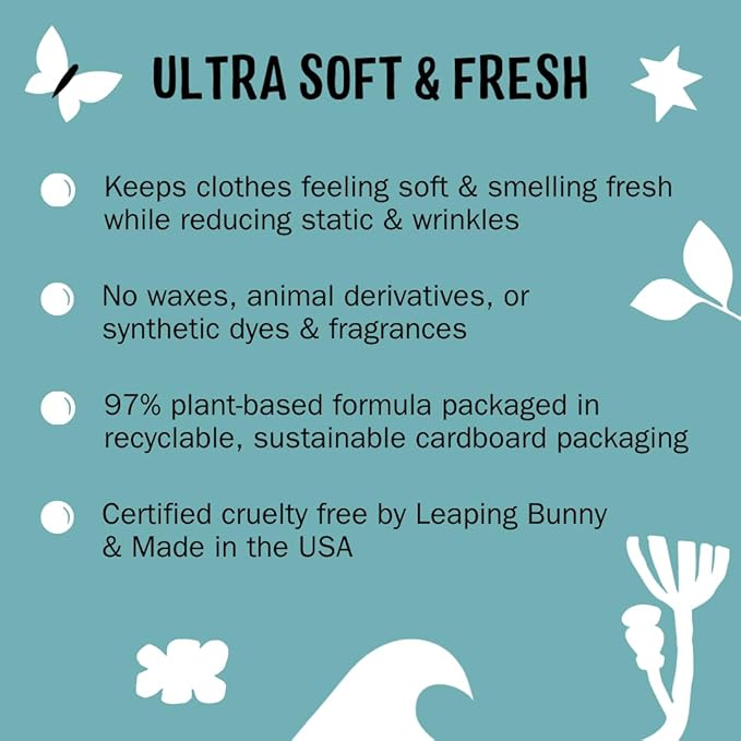 - SOFT-STATIC FREE CLOTHES: Our 97% plant-based dryer sheets employ a gentle fabric softening technology to leave clothes feeling fresh, cozy, and comfy. Better for people with sensitive skin, the environment, and your dryer, these dryer sheets effectively eliminate static so you and your clothes look and feel your best