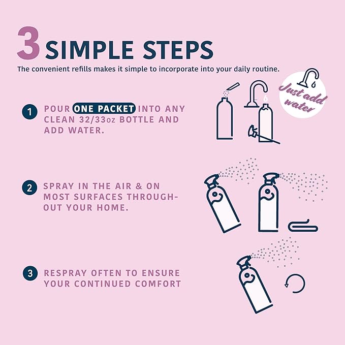 - 3 Simple Steps - Add water to the bottle. Liberally spray in the air and on surfaces throughout your home. Repeat as needed. Use refill when the bottle is empty to help save on plastic waste..