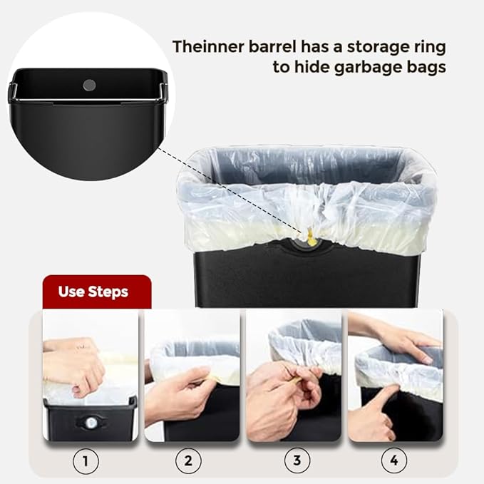 - 【Material and appearance】: This garbage can is made of stainless steel and thick pp plastic, the outer bucket is easy to clean, the inner bucket can be lifted out to clean, the inner bucket has a storage ring, and the garbage bag is not exposed.