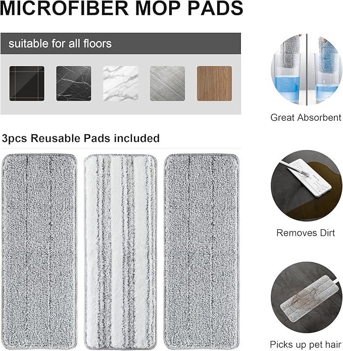 - [MICROFIBER PADS] With 3pcs microfiber pads for floor cleaning. Super absorption let you easily do any wet or dry cleaning.