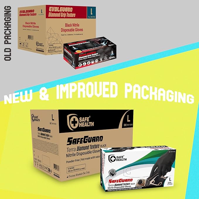 - HEAVY GLOVES WITH EXCELLENT PUNCTURE RESISTANCE: 5.5 mil SafeHealth EvolGuard nitrile black diamond grip textured disposable gloves are highly durable and resistant to rips and tear, which provide comfort and deliver excellent tactile sensitivity and superior strength in puncture resistance.
