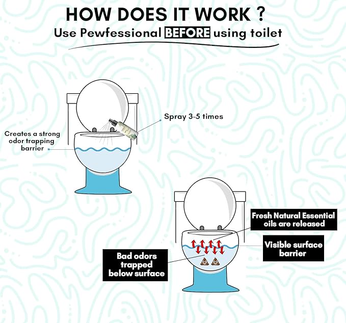 - WHY PEWFESSIONAL IS YOUR NEXT LEVEL DAILY NECESSITY: Pewfessional Pre Poop Toilet Spray’s advanced formula traps bad toilet odors beneath the toilet’s water line while releasing enchanting natural scents. This ensures your bathroom smells fresh and clean, stopping toilet odors before they even begin. Versatile and effective, use our before you go toilet spray to elevate your bathroom experience. Pewfessional is a must have for every household!
