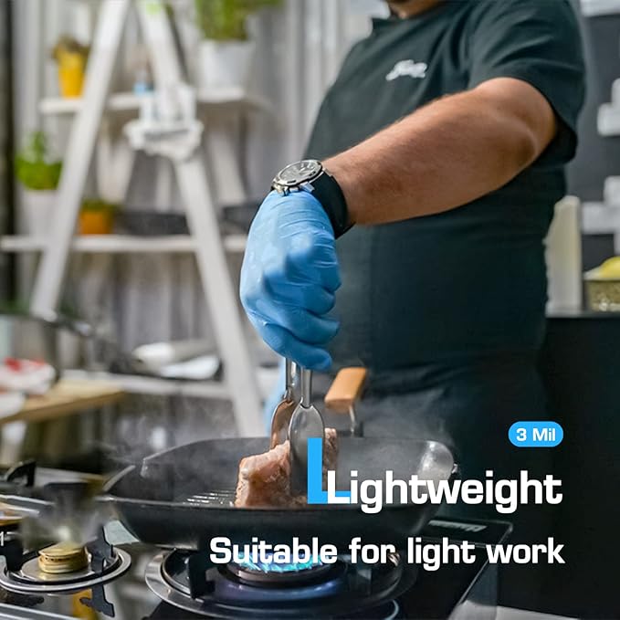 - Slim Design: 3mil thickness nitrile gloves offer great dexterity, fits the palm of the hand. Light duty work gloves for examination, household cleaning, food prep, food service, esthetician, salon, and maintenance.