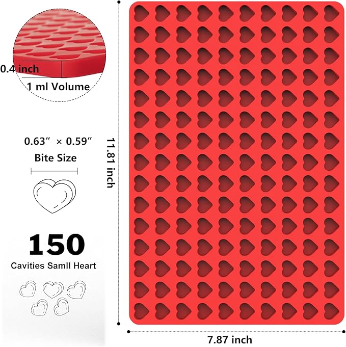 - SAFE CONTACT WITH FOOD: Candy mold overall dimension is 7.87’’ x 11.8’’ x 0.4’’. Total 150 cute heart shape cavities. Each heart shape cavity size is 0.63’’ x 0.59’’. Food-grade silicone mold with good heat resistance. It's BPA free and has no peculiar smell. Suitable for ovens and microwave ovens. It can directly and safely contact with food.