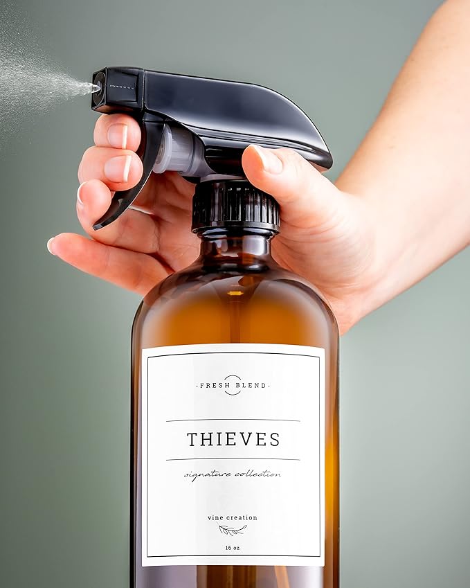 Vine Creations Amber Glass Spray Bottles, 2 Pack Glass Refillable Bottles for Cleaning solutions, 16 oz Spray Bottle for Cleaning, Mister Spray Bottle, Amber Spray Bottles with Waterproof Labels