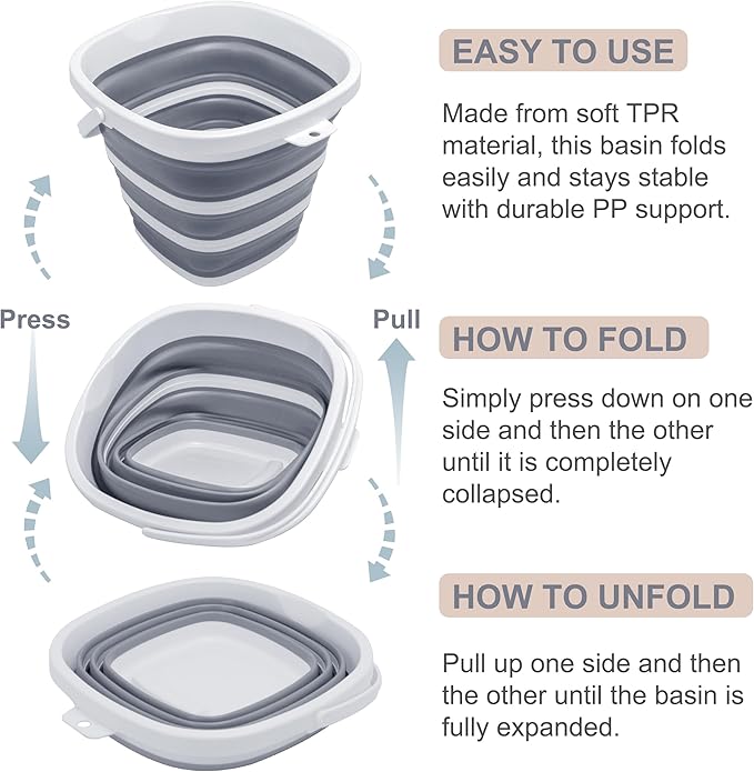 - 【Versatile Square Design】This 2.6-gallon (10L) collapsible bucket features a space-efficient square shape that fits neatly in corners. Perfect as a mop pail, car wash basin, or camping sink.