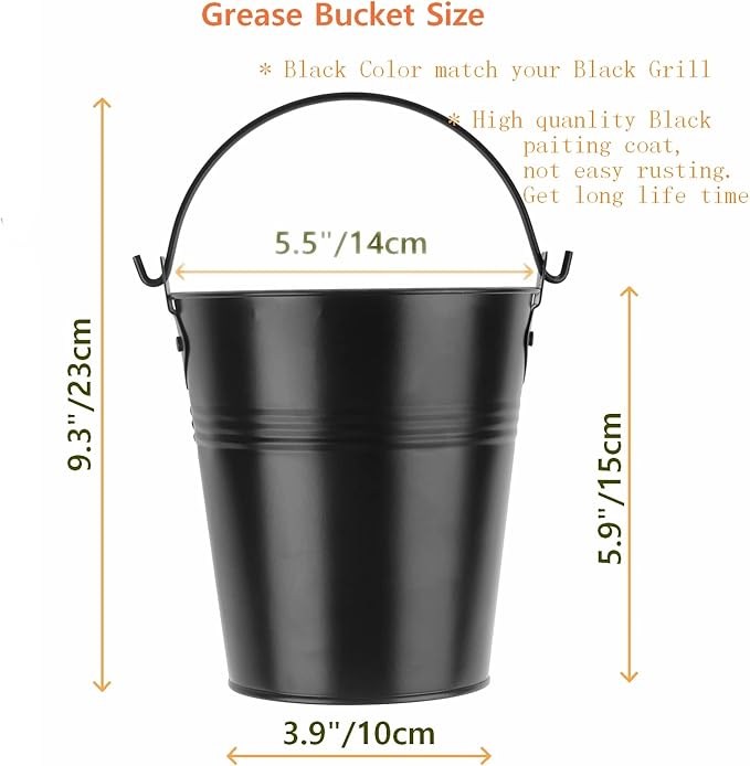 - 【GREASE BUCKET】- Made of high quality materials of durable galvanized steel ,this weather-resistant galvanized steel smoker grease bucket won't rust or absorb outdoors.Size: 5.5in /14cm (W) x 5.9in/15cm (H)