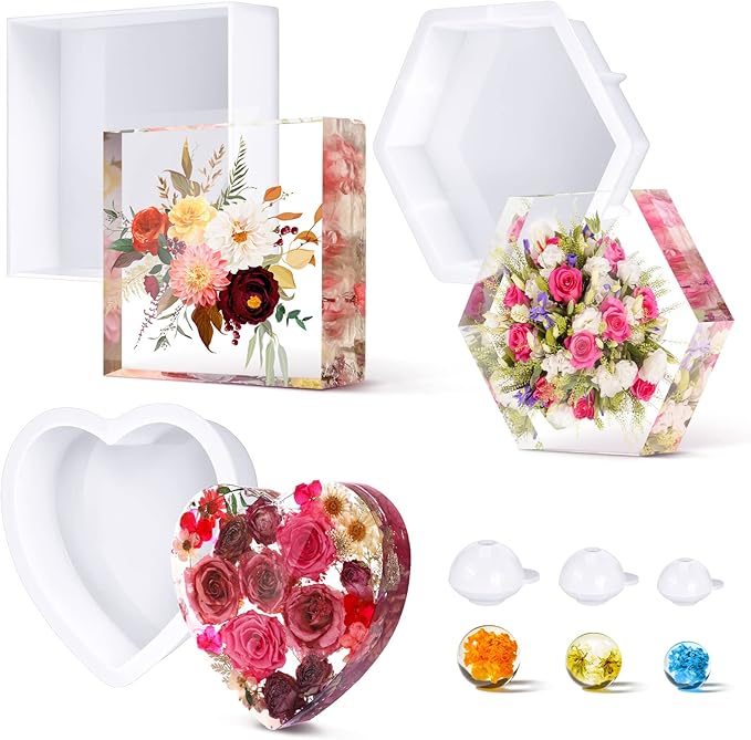 3 Pcs Large Silicone Molds for Resin - Glossy Deep Square, Hexagon, Heart Bookends & Round Molds for Flowers Preservation & DIY Art Making