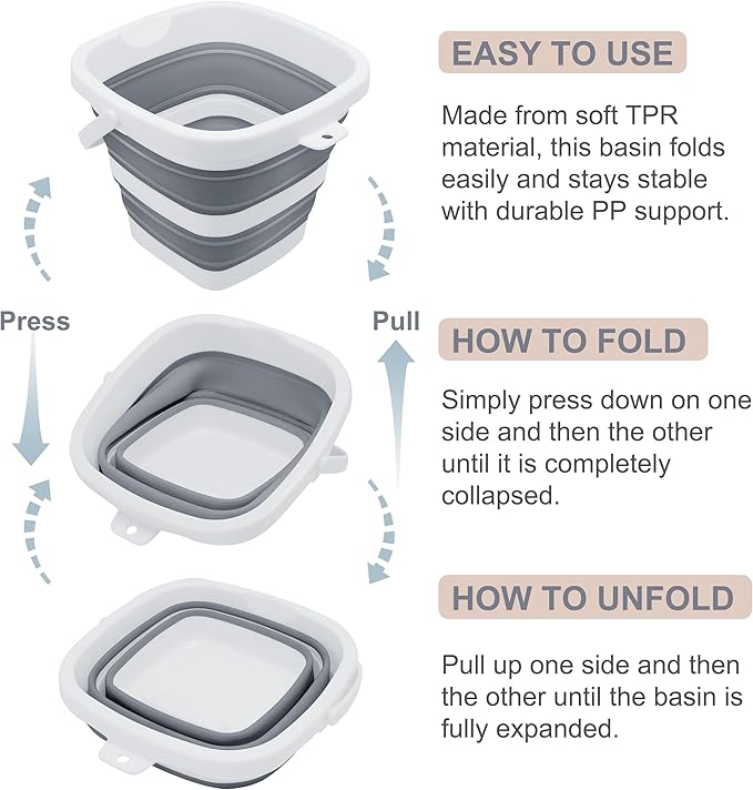 - 【Compact and Foldable】Expands to 10"L × 10"W × 8"H (5L/1.4Gal capacity). Collapses to just 2" thick for easy storage. Fits in tight spaces like car trunks and RVs.