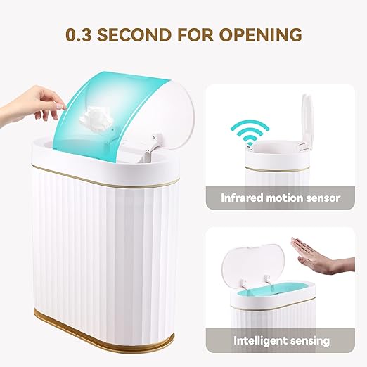 ELPHECO Bathroom Trash Can with lid 2.5 Gallon Waterproof Motion Sensor Wastebasket, Automatic Trash Bin Bathroom Decor for Bedroom and Office White with Golden Trim