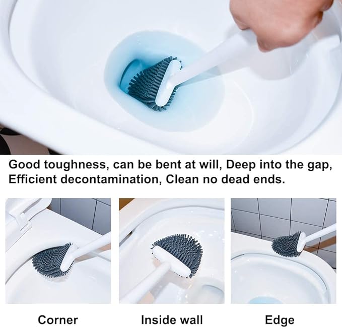 - Easily Clean Dead Corner: The flat silicone toilet brush head can be bent to fit the angle of the rim, reaching under the rim. The tip of the brush head is designed to clean the edge of the toilet bowl better by bending the brush head upward