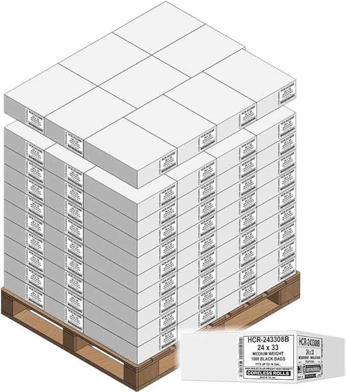 Aluf Plastics 12-16 Gallon Black Trash Bags (1000 Count) - 24" x 33" - 8 Micron Equivalent High Density Value Garbage Bags for Bathroom,Recycling(1 Pallet of 100 Cases, 100000 Bags Total)
