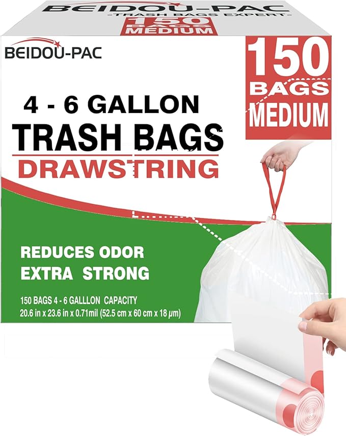 - Product Information:BEIDOU-PAC Trash Bags, 4-6 Gallon 20.6 inch x 23.6 inch x 0.71 mil, 25 bags per roll, 6 rolls, 150 bags total. Our drawstring trash can liners are designed to fit perfectly in each 4, 5, and 6 gallon capacity kitchen trash can.