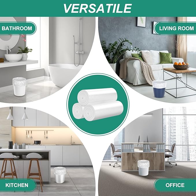 - CLEAR WHITE TRASH BAGS 4 GALLON: Clear white small bathroom garbage bags are perfect for garbage sorting without complication. These 4 gallon garbage bags for bathroom can are see-through but tough enough to handle your daily chores. These small waste basket liners 4 gallon have been a big hit as they definitely add a cozy and simple sparkle to your home sweet home.