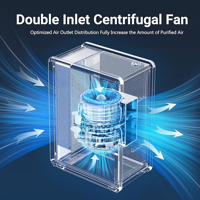 - High Performance: Home air purifier can enjoy fresh air in 11 minutes. The forward-inclined double-inlet centrifugal fan is used to pressurize the air at a high speed, fully increase the purification air volume, and improve the efficiency of air purification