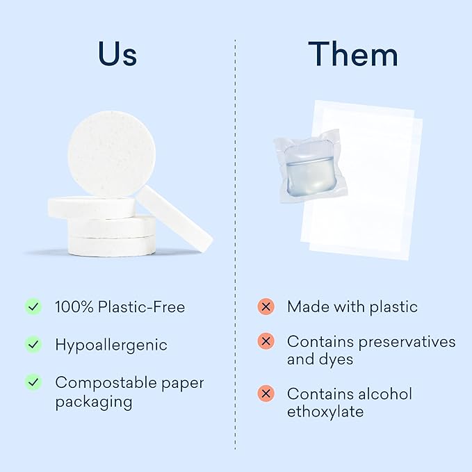 - PLASTIC-FREE, ECO-FRIENDLY LAUNDRY TABLETS. Tough on stains, gentle on the planet. Our 100% plastic-free tablet is tried, tested, and proven to lift the toughest stains—from grass and coffee to food and makeup—without any harsh chemicals. Formulated safe for family, healthier for planet, and powerfully effective so you can ditch plastic pods and sheets for a higher standard of clean. Includes a refillable Forever Tin for easy storage.