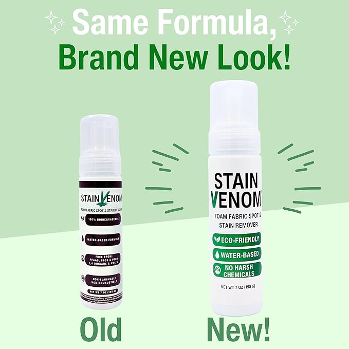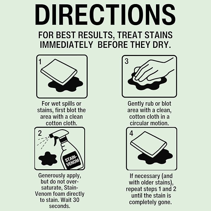 - Stain Venom foam cleaner’s fast penetrating formula effectively removes tough stains that include (but not limited to) fresh pet stains, red wine, blood, lipstick, motor oil, coffee, and even mustard. formulated with the latest state-of-the-art technology