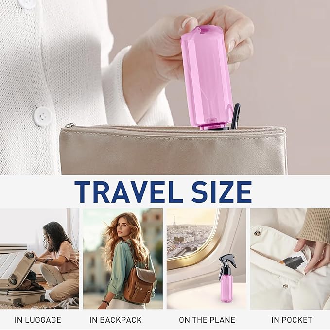 - Specification Capacity: 50ml/2oz, package: 5pcs. The travel mist bottle also can be a portable hair spray bottle and great for travel, vacation, camping, business trips and daily life