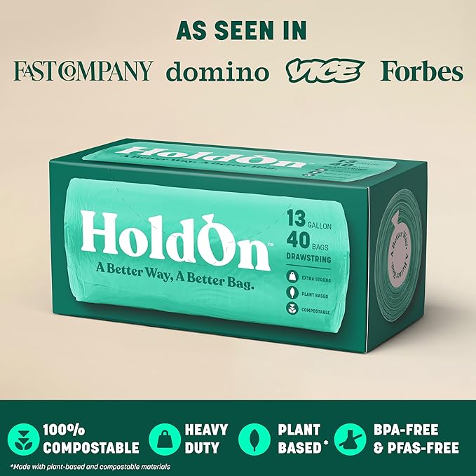 HoldOn 13-Gallon Trash Bags – Plant-based Tall Kitchen Trash Bags with Drawstring Handles for Tall Trash Bins, Heavy-duty and Compostable Large Trash Bags (40 bags)