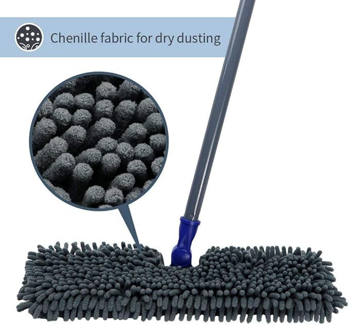 - Effective Cleaning:The microfiber mop head is good at absobing water and grabbing small pieces of dust, dirt, pet fur, hair and other waste during cleaning. Also, the chenille fabric is soft enough not to leave scratches.