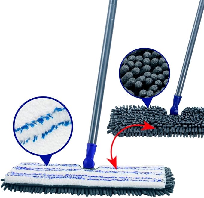 - Double-Sided Mop Pad:These flip mop pads can be used both wet and dry.One side features chenille fabric for dry dusting from floors,ceilings,and other surfaces. Alternatively, you can moisten the microfiber side with water for deep cleaning.