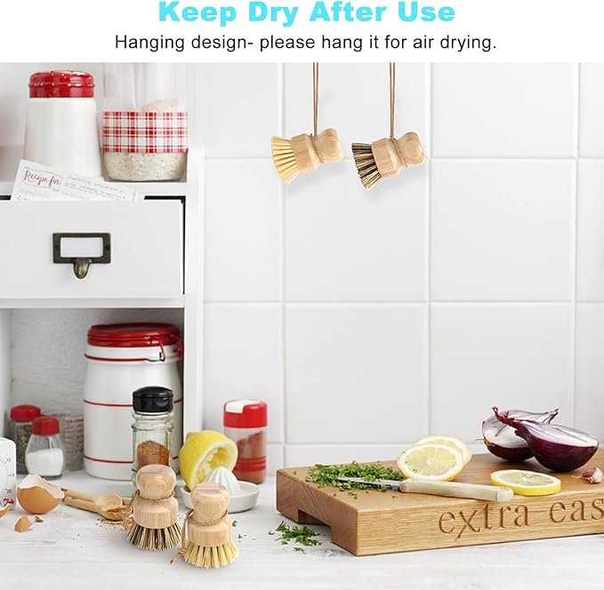 - 【Ergonomic Handle】Wood dishes scrub brush, offering ultra comfortable grips and fitting well with your palm. Ergonomiclly designed bamboo handle has a nice groove at the middle part of the brush, bamboo dish brush set will have you a very comfortable grip & control when tough scrubbing.