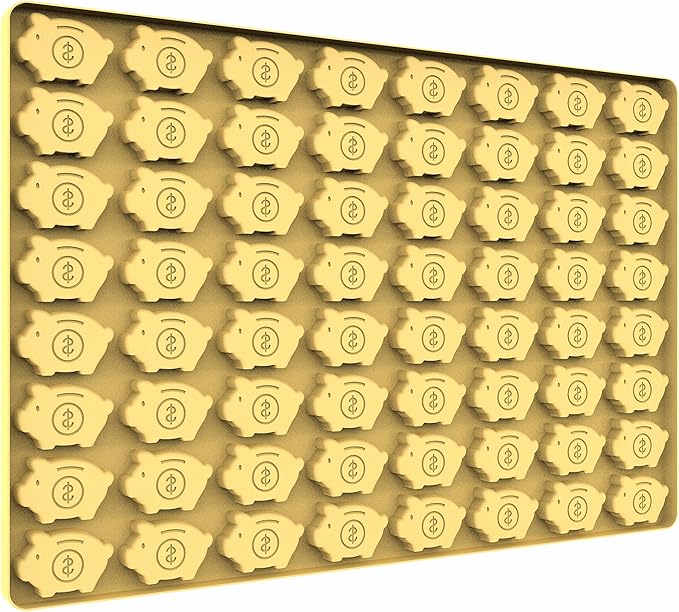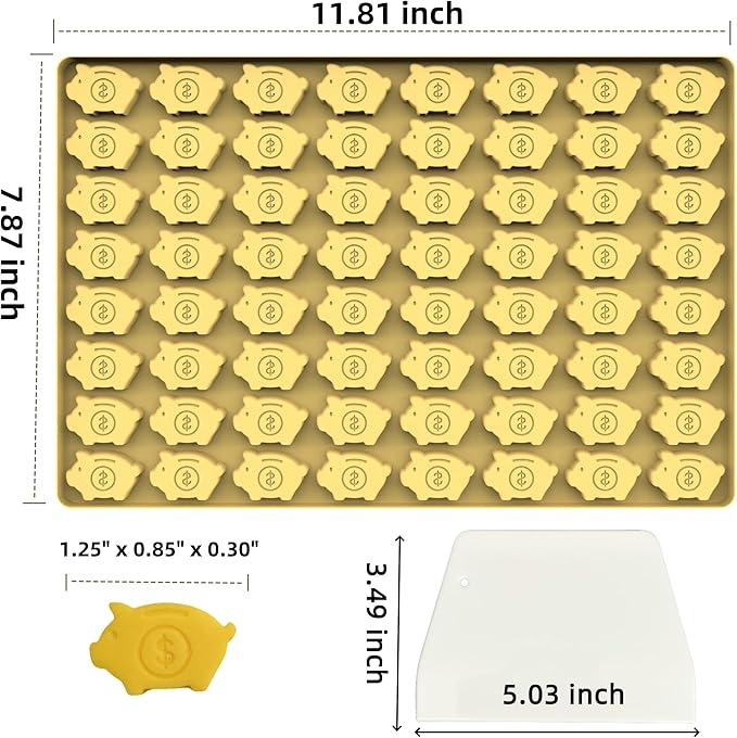 - 【 Adorable Piggy Bank Design】Each candy mold includes 64 piggy bank-shaped cavities for efficient batch production. Piggy Bank Candy Mold Size : 11.81” x 7.87”x 0.35",Mold Layout: 8 x 8,Cavity Size: 1.25" x 0.85" x 0.30", each cavity hold 3.8ml.
