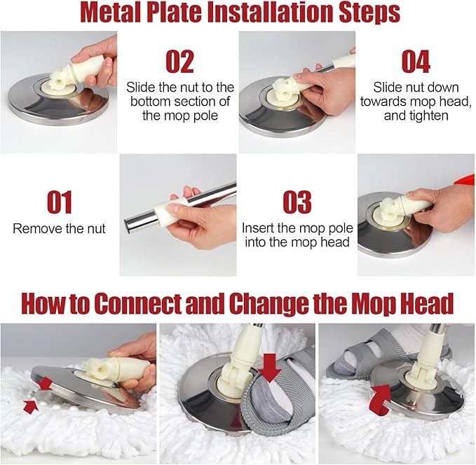 - 【Wide Application】The spinning mop and bucket is wet or dry usage, 360° microfiber spinning mop head easily reaches any difficult corners and gaps without feeling the scrape, with excellent absorption capacity, deep-cleaning microfiber removes and absorbs tough dirt, dust, pet hair, grime, perfect for all types of surfaces, like laminate, hardwood, ceramic, tiles, glass, etc. Microfiber Mop Head is machine-washable and reusable.
