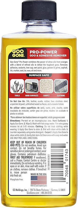 - PRO-POWER FORMULA: Goo Gone's Pro-Power Formula is built to defeat the toughest GOO's you have in your home, garage, workshop, RV, boat, motorhome or trailer!