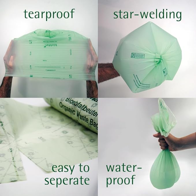 - PREMIUM QUALITY: Our bioMat compost bags are entirely made of plastic-free renewable resources like Non-GMO corn starch. Worldwide proven multi-layer film technology guarantees leak-proof usage and helps to save valuable resources. bioMat 1.2 gallon compost bags are free of PFAS and BPA.