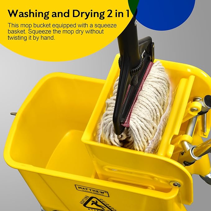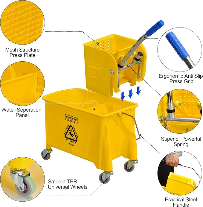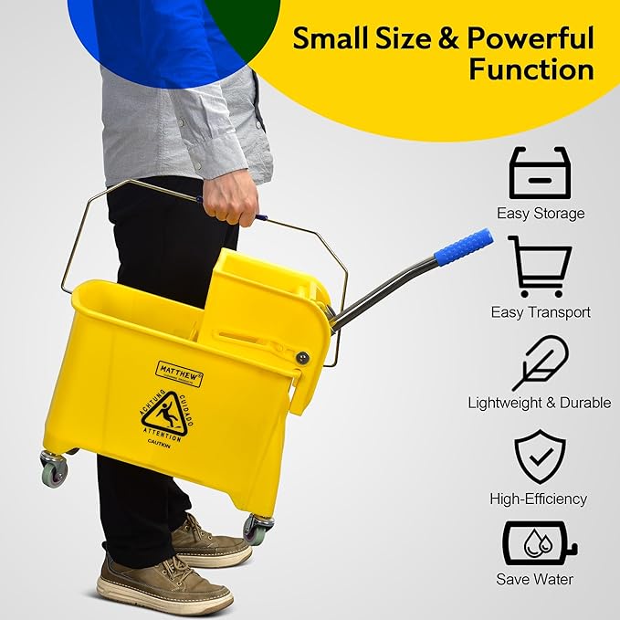 Matthew Cleaning 22 Quart Compact Mop Bucket INCL.2 Pack Mop Head with Side Press Wringer On Wheels,Tandem Portable Floor Cleaning Wavebrake,Ideal for Household,Industrial,Restaurant,Janitorial Use