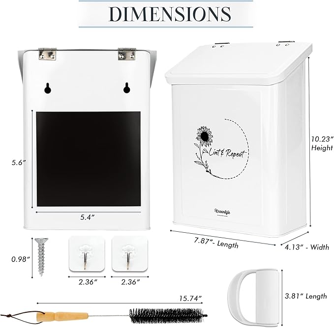 - INCLUDED IN THE PACKAGE: The set comes with 1x white metal lint bin,1 x Lint brush, 1 x lint clothes roller with 2 x Adhesive hooks to hang on, and 4 x Screws to mount the containers; With everything you need in one package, your laundry organization and storage will never be the same
