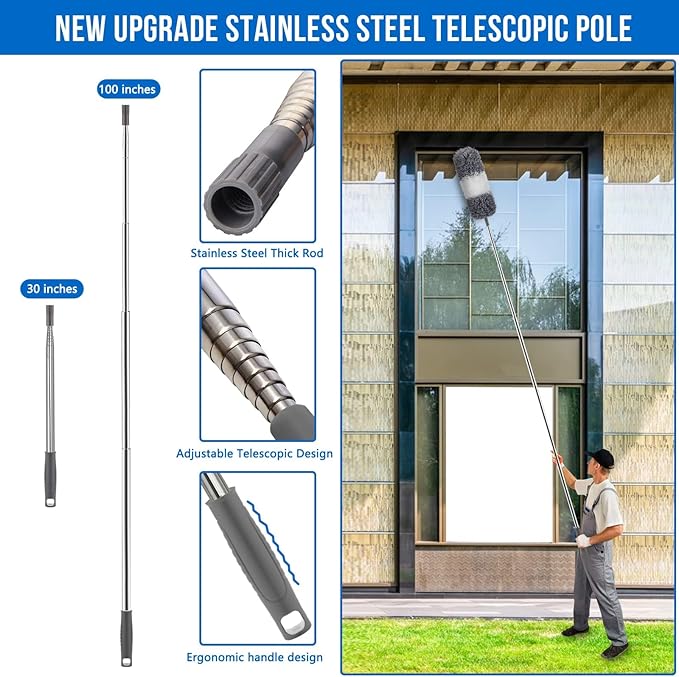 - ERGONOMICALLY LONG TELESCOPING DUSTER: The telescopic duster with a stainless steel handle extends from 30 to 100 inches, providing a sturdy, comfortable grip Reach difficult corners and gaps without climbing ladders