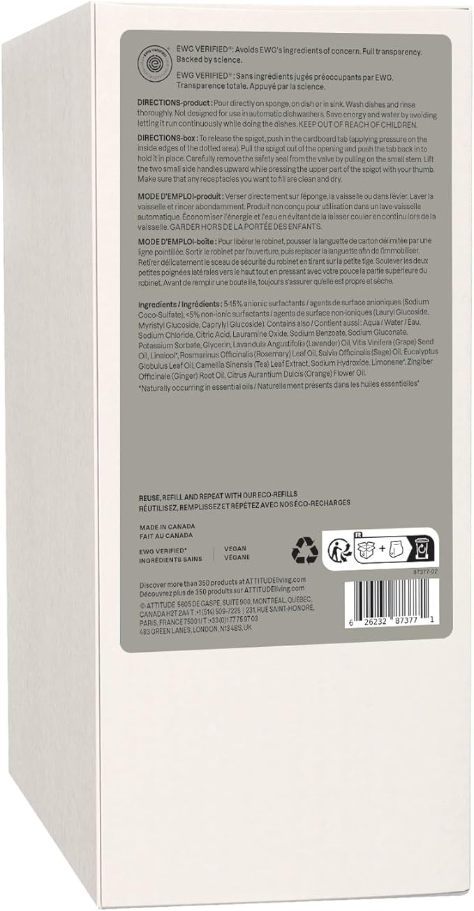 ATTITUDE Dish Soap, EWG Verified, Plant and Mineral-Based Ingredients, Vegan and Cruelty-free Household Products, Lavender and Rosemary, 67.6 Fl Oz