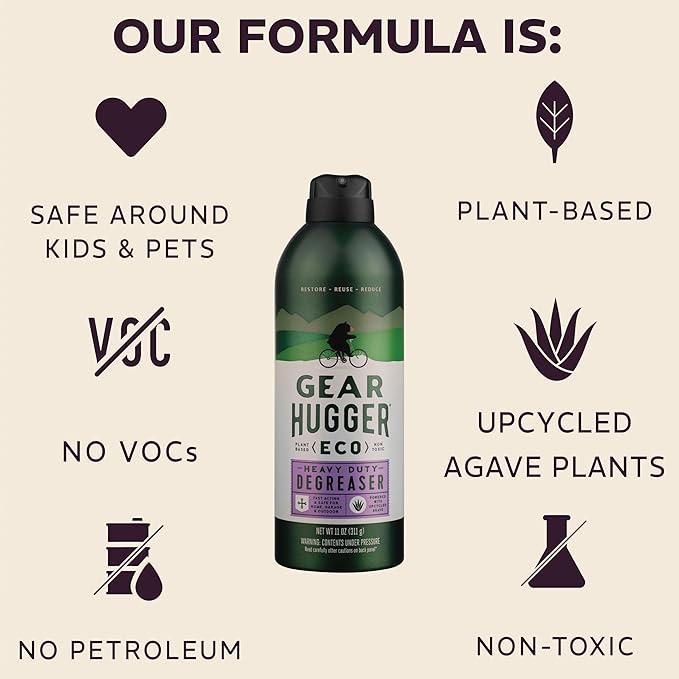 - ENVIRONMENTALLY FRIENDLY DEGREASER - Gear Hugger is created with upcycled waste from the production of tequila as a source for agave plants rich in saponins, which produce foam to clear surfaces without harming the environment. The natural, biodegradable solvents replace harmful petroleum and PTFE chemicals for a water-based formula that’s USDA Certified 96% bio-based. Make an eco-friendly choice to ensure all your gear functions optimally, lasts longer and stays out of the landfill.
