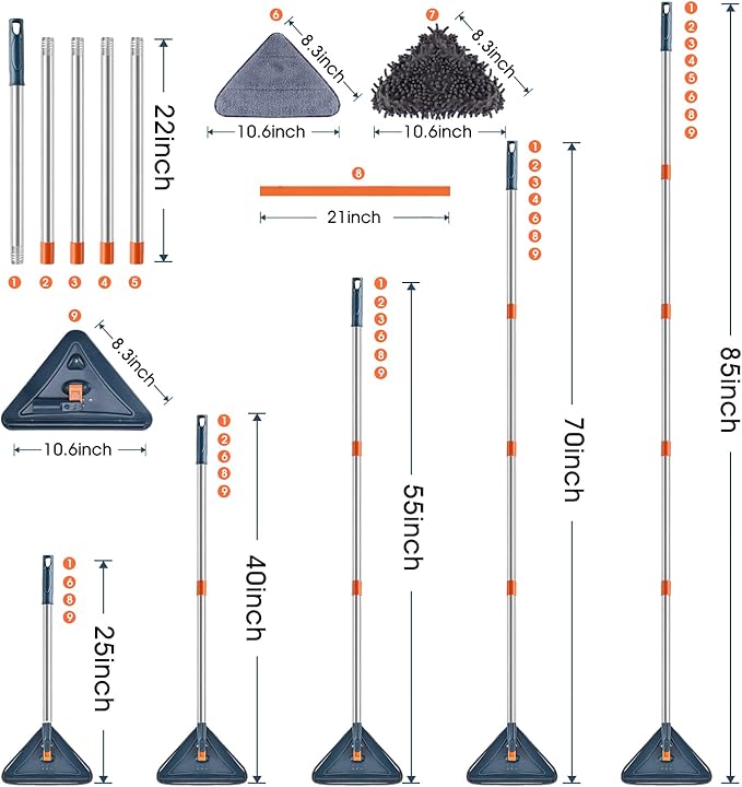 - Adjustable Long Handle: Equipped with 5 section extension rods, you can customize the length according to your needs. With adjustable lengths range of 40-85 inches, you can easily clean high or low places without the need for ladders or bending over. Easy to install. No screws required, just connect the rods and mop head together for easy cleaning.