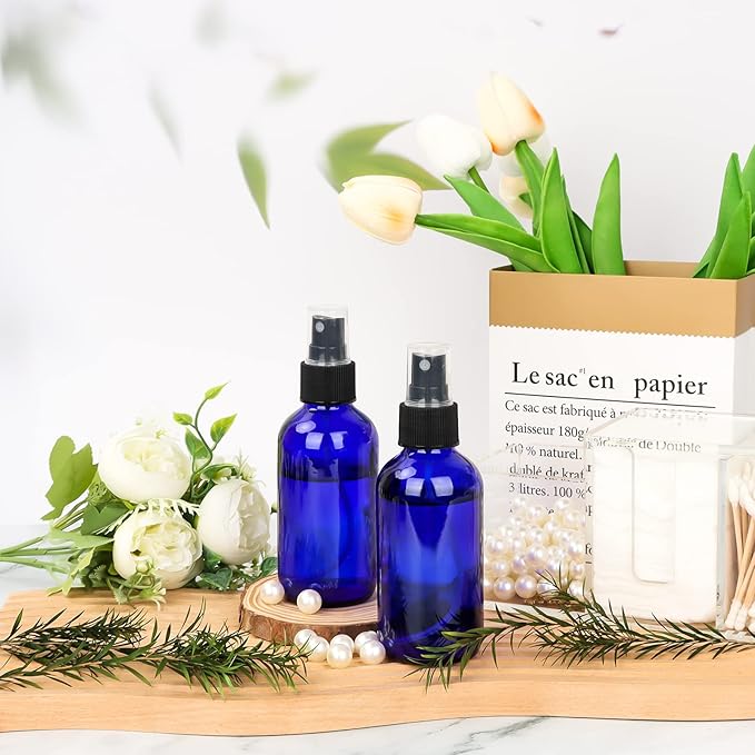 CycleMore 120ml 16 Pack 4oz Blue Glass Spray Bottles with Fine Mist Sprayers, Glass Travel Bottles for Cosmetic, Essential Oils, Cleaning Solutions, Perfumes & More Liquids Ideal for Friends