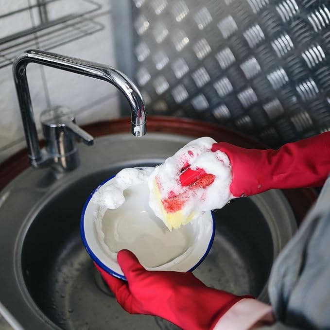 - Latex-Free: The dish gloves have no strange odor. The 13-inch length can keep your hands and forearms clean and dry, preventing water from penetrating.