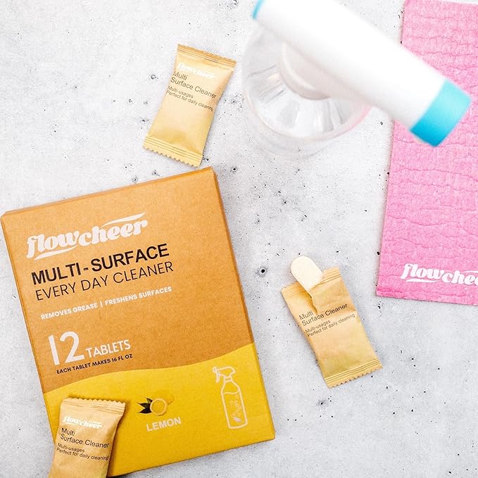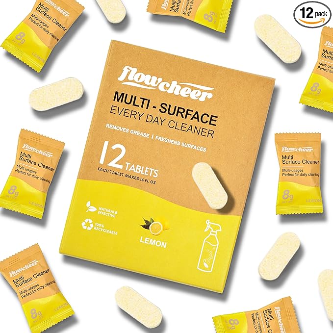- Multi-surface Cleaner Refill-All purpose cleaner tablets do not only Save Space in your cabinet, but also Refill your bottles repeatedly and save your money to buy bulk traditional cleaners. Simply add a FLOWCHEER all-purpose cleaning tablet to water in a reusable spray bottle and you're off to a clean house
