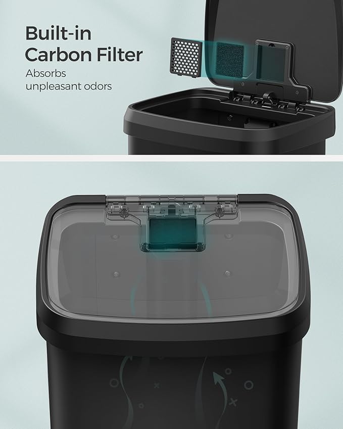 - [Thoughtful Detailing] The carbon filter in the lid helps absorb unpleasant odors, keeping your kitchen smelling fresh. Included are 15 liner bags (12-14.5 gallons) that perfectly fit this kitchen can