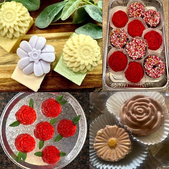 - SIZE:Set of 3 flower siicone soap molds .As the picture:the size of each is 11in * 6.5in * 1.18 in(approx 4 oz),and 9.65in * 6.5in * 1.18 in (approx 3.5 oz).Flower shape silicone molds can be used for making soap, bath bomb, shower steamer,shampoo bar,resin crafts, etc.