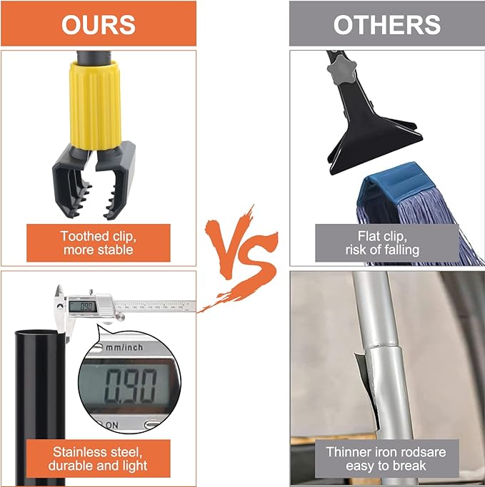 - 👍【Upgrade Jaw Clamp Mop】Compared with the clip connection, our string mop adopts the newly upgraded claw clamp, which can hold the mop head firmly, makes connection more stable,makes removing and replacing mops easily and efficiently,easy to install,match with most mops, such as cotton, string, looped, microfiber mops.