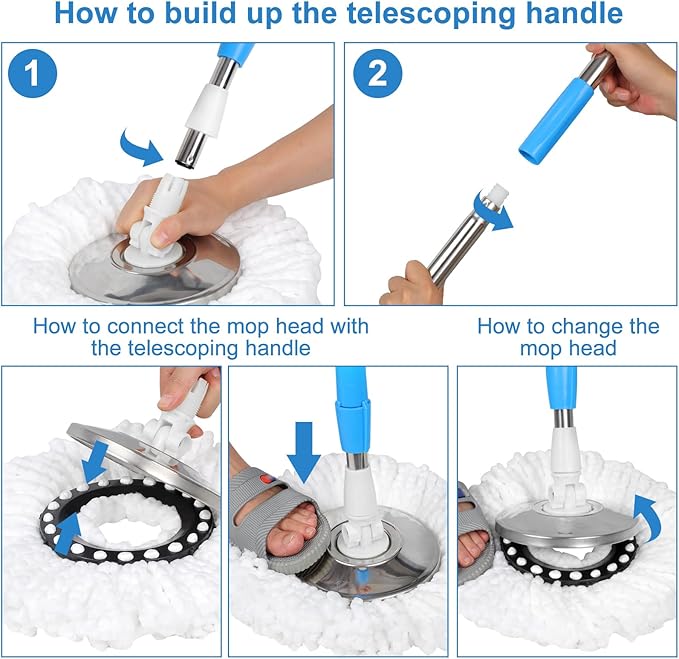 - 【Wide Application】The spinning mop and bucket is wet or dry usage, 360° microfiber spinning mop head easily reaches any difficult corners and gaps without feeling the scrape, with excellent absorption capacity, deep-cleaning microfiber removes and absorbs tough dirt, dust, pet hair, grime, perfect for all types of surfaces, like laminate, hardwood, ceramic, tiles, glass, etc. Microfiber Mop Head is machine-washable and reusable.