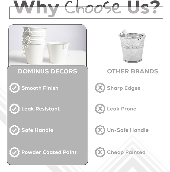 - Solid, Stable, and Built to Last: These rust-resistant mini buckets are built for real life, not just for show; Each small metal bucket is designed with smooth edges that won't snag, an easy-to-grip handle that stays attached, and a finish that can take a beating