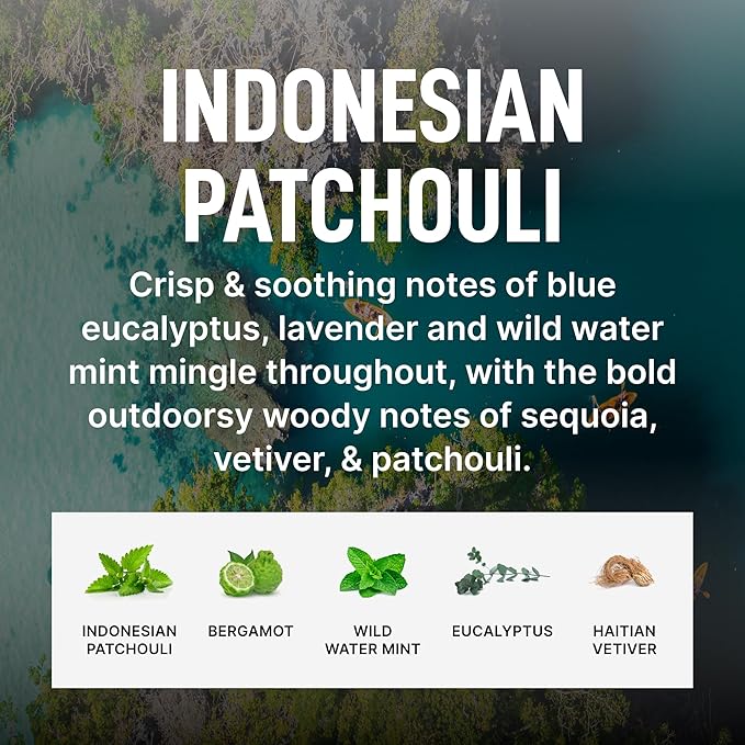 - Indonesian Patchouli: Crisp & soothing notes of blue eucalyptus, lavender and wild water mint seamlessly blend with the bold outdoorsy woody notes of sequoia, vetiver, and patchouli, offering a sense of well-being, while effervescent citrus; bergamot and tart calamansi add refreshment. The theme is further complemented by touches of cardamom, clove and nutmeg creating a spirited and energetic modernity.