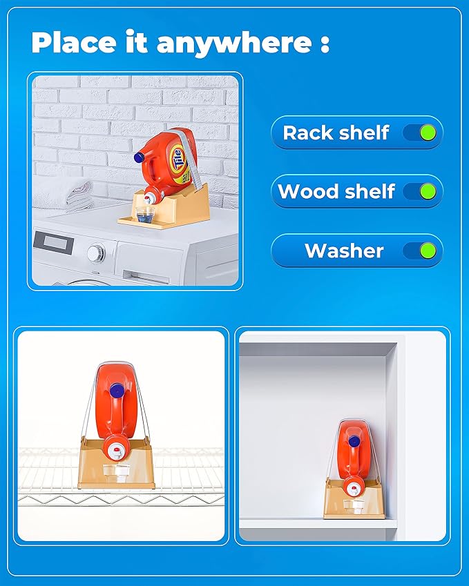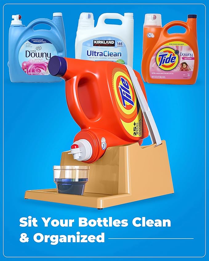 - [Versatile Fit:] The liquid laundry detergent holder station's optimal size (7.9"L x 12.2"W x 5.5"H) accommodates various bottle sizes, providing a perfect fit for most detergent containers without taking up too much space. (Laundry Soap, Cup, and Bottles NOT Included)