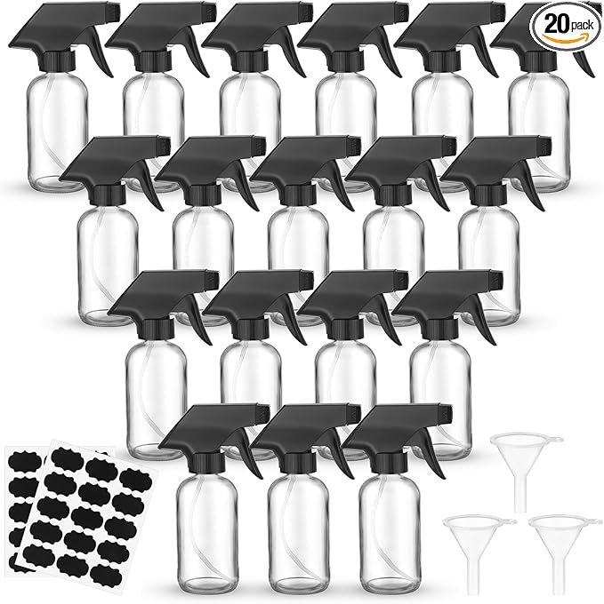 Fumete 20 Pcs 4 oz Glass Spray Bottles Empty Refillable Sprayer Containers with Funnels Labels Black Trigger Sprayers Spray Bottles for Essential Oil DIY Kitchen Hair Plants(Clear)