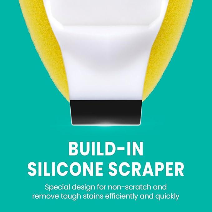 - NON-SCRATCH AND RELIABLE MATERIAL: Made of high-density absorbent sponge fabric and non-scratch cellulose microfiber materials, non-toxic and sturdy. The silicone scraper won't scratch surfaces like a hard scraper, and more efficiently remove stains
